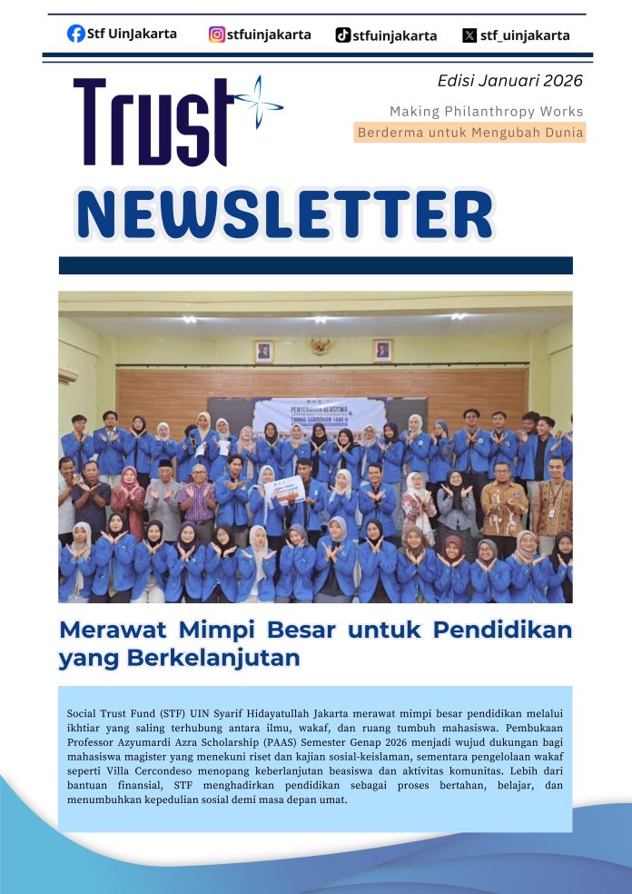 Beranda Newsletter Trust NEWSLETTER TRUST Edisi Januari 2026 Newsletter Trust NEWSLETTER TRUST Edisi Januari 2026 Penulis Volunteer STF UIN Jakarta - 24 Februari 2026 16 Facebook Twitter Google+ Pinterest WhatsApp Newsletter Trust edisi Januari 2026 bisa diunduh selengkapnya melaui link dibawah ini : Newsletter Trust Edisi Januari 2026 BERITA TERKAITDARI PENULIS Newsletter Trust NEWSLETTER TRUST Edisi Desember 2025 Newsletter Trust NEWSLETTER TRUST edisi November 2025 Newsletter Trust NEWSLETTER TRUST edisi Oktober 2025 LEAVE A REPLY Batal balasan Please enter your comment! Please enter your name here You have entered an incorrect email address! Please enter your email address here Save my name, email, and website in this browser for the next time I comment. Δ Laporan Penghimpunan Laporan Penghimpunan STF UIN Jakarta Periode Januari 2026 Laporan Penghimpunan Social Trust Fund UIN Jakarta - 23 Februari 2026 Newsletter Trust