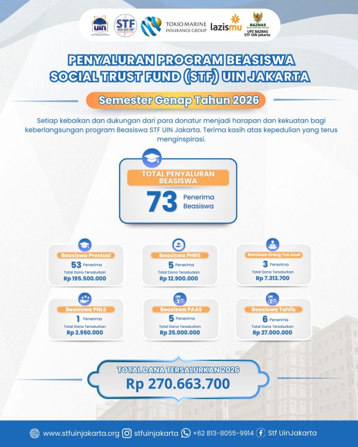 Jakarta – Social Trust Fund (STF) UIN Jakarta kembali menegaskan komitmennya dalam mendukung keberlanjutan pendidikan mahasiswa melalui penyaluran program beasiswa Semester Genap Tahun 2026. Pada periode ini, sebanyak 73 mahasiswa resmi menerima bantuan pendidikan dengan total dana yang tersalurkan mencapai Rp 270.663.700.
