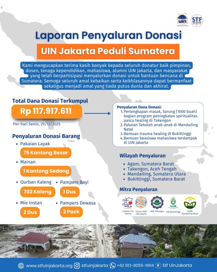 Jakarta – UIN Syarif Hidayatullah Jakarta melalui Social Trust Fund (STF) menyalurkan bantuan kemanusiaan bagi masyarakat terdampak bencana di sejumlah wilayah Sumatera. Bantuan tersebut merupakan hasil donasi dari sivitas akademika UIN Jakarta dan masyarakat luas yang dihimpun dalam program “UIN Jakarta Peduli Sumatera.” Penyaluran bantuan tersebut dilaporkan per Senin (29/12/2025).