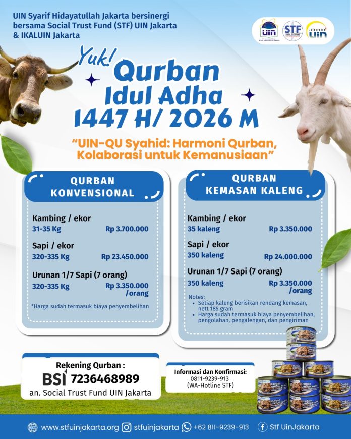 Jakarta — Dalam rangka menyambut Hari Raya Idul Adha 1447 H/2026 M, UIN Syarif Hidayatullah Jakarta bersama Social Trust Fund (STF) UIN Jakarta dan IKALUIN Jakarta menjalin sinergi untuk mengoptimalkan potensi momentum qurban. Upaya ini diarahkan agar memberikan dampak yang luas (high impact), baik dari aspek pengelolaan, pendistribusian, maupun pemanfaatannya, sekaligus memperkuat peran UIN Jakarta dalam gerakan filantropi di Indonesia.