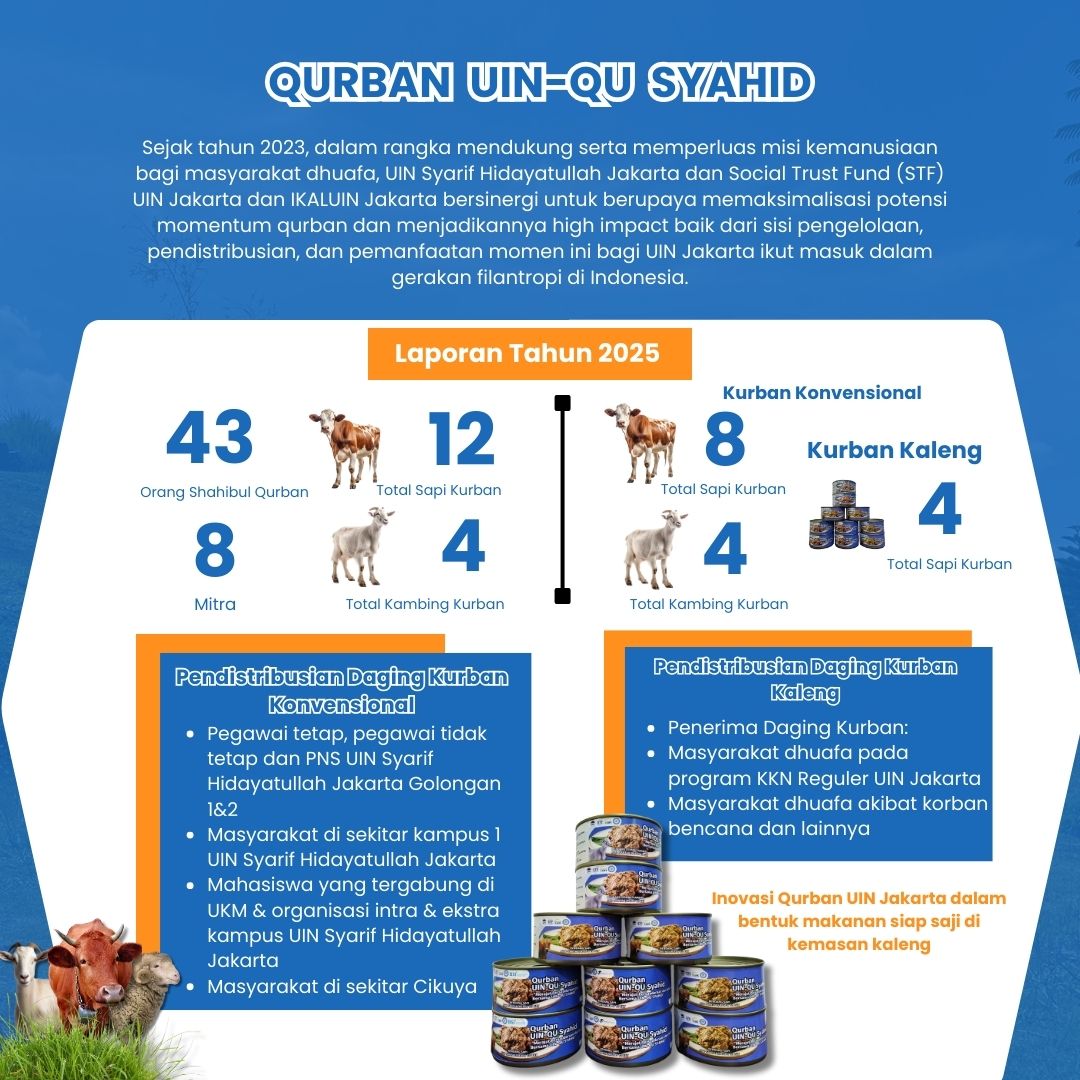 Sejak tahun 2023, dalam rangka mendukung serta memperluas misi kemanusiaan bagi masyarakat dhuafa, UIN Syarif Hidayatullah Jakarta dan Social Trust Fund (STF) UIN Jakarta dan IKALUIN Jakarta bersinergi untuk berupaya memaksimalisasi potensi momentum qurban dan menjadikannya high impact baik dari sisi pengelolaan, pendistribusian, dan pemanfaatan momen ini bagi UIN Jakarta ikut masuk dalam gerakan filantropi di Indonesia.